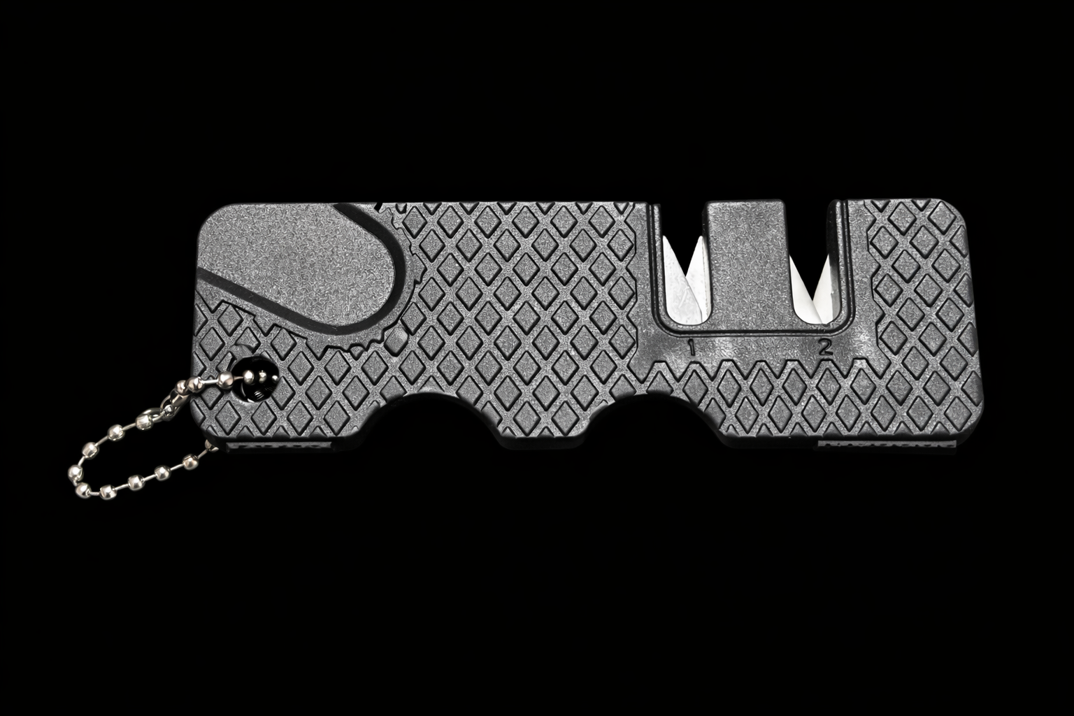 Key ring chain included. Features both carbide and ceramic sharpeners. Rubber feet to help keep sharpener firmly in place while working. As with all pocket sharpeners, this is not going to put a razor edge on your knife from dull, but is great for touchups and keeping a working edge on your knife while in the field.