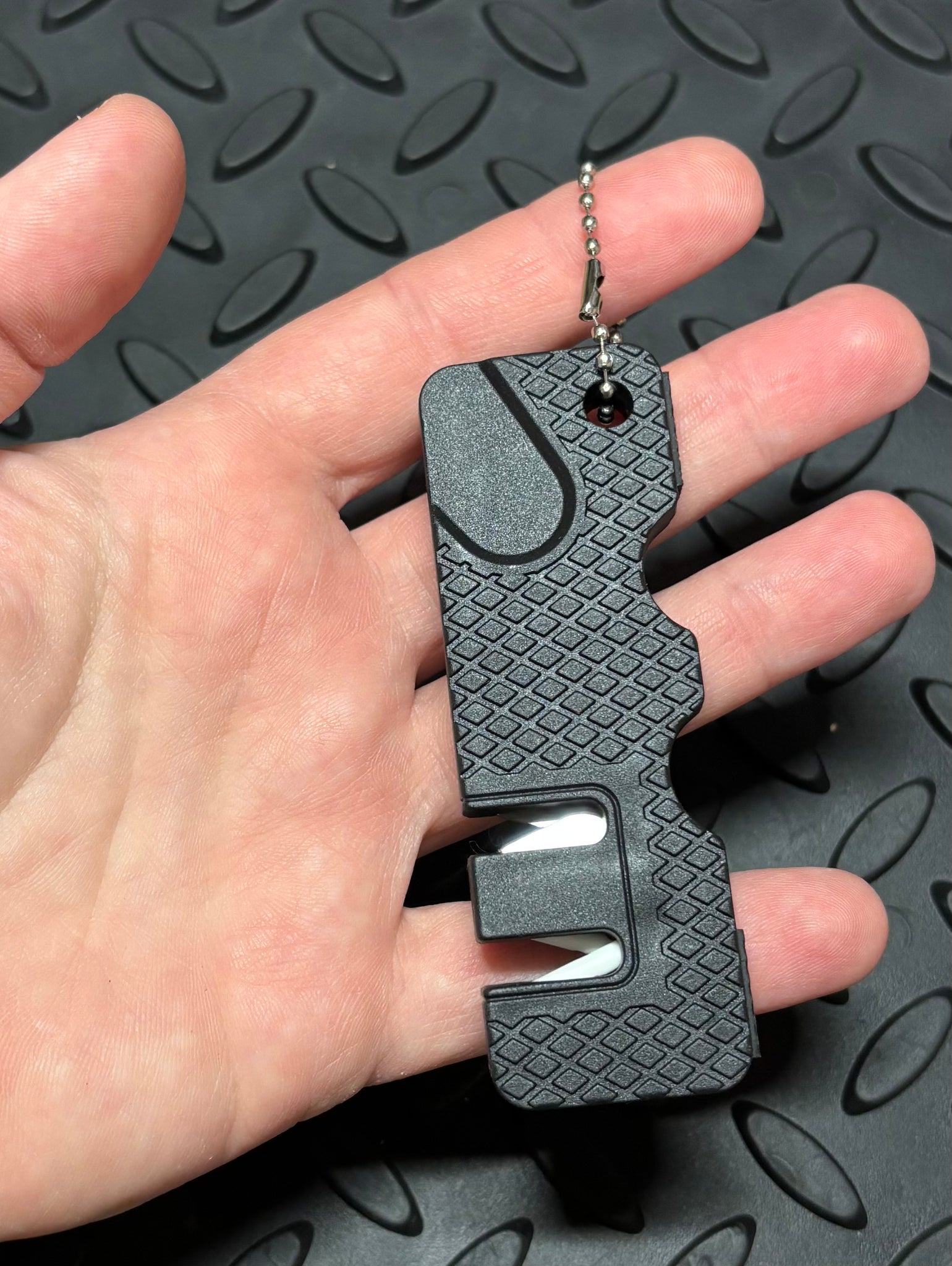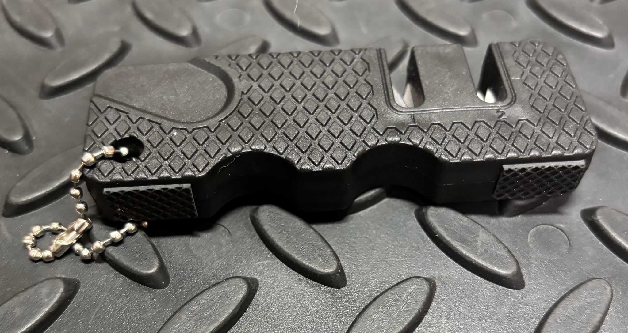 Key ring chain included. Features both carbide and ceramic sharpeners. Rubber feet to help keep sharpener firmly in place while working. As with all pocket sharpeners, this is not going to put a razor edge on your knife from dull, but is great for touchups and keeping a working edge on your knife while in the field.
