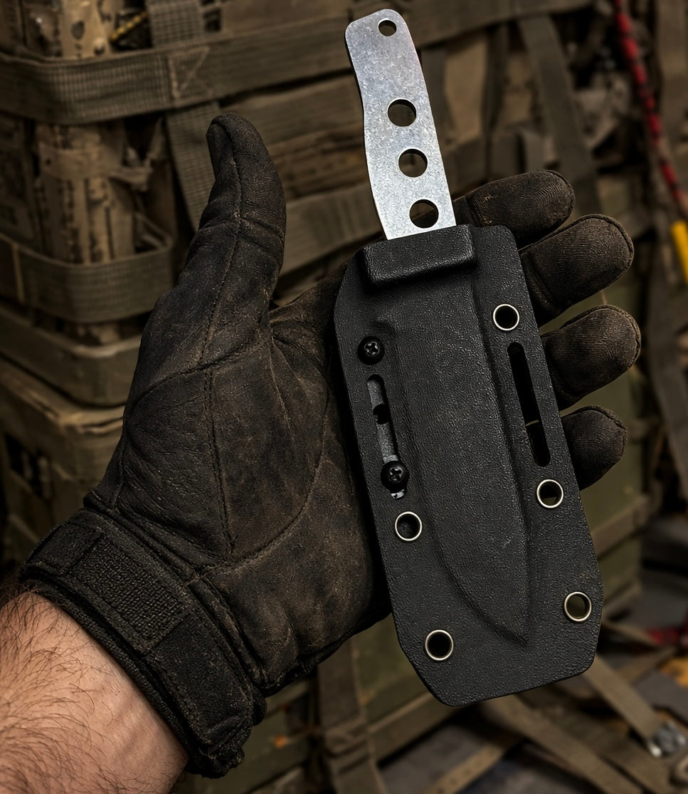 The sheath is built with the same mindset - rugged, modular, and adaptable - featuring reinforced eyelets and a universal mounting slot compatible with virtually every clip system on the market. Carry it how you want. Deploy it when it matters.